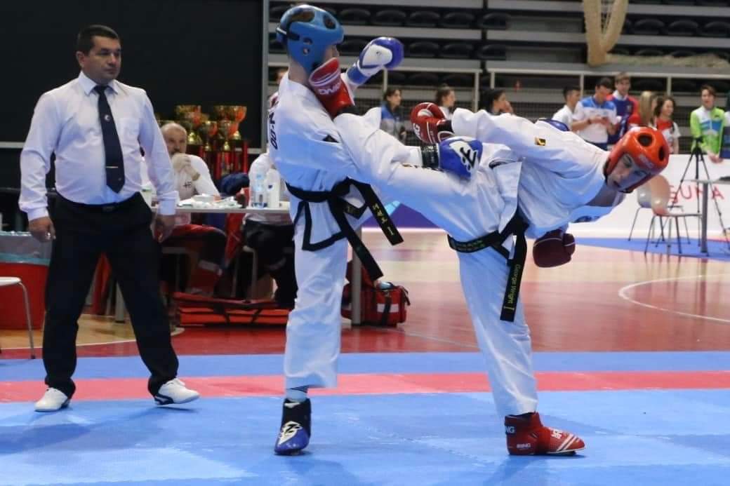 Day 4 saw George on the mats for his group stages of Junior Male 16 to 17 -69 kg Sparring. In his first match against Jakub Komarek of Czechia a 360 back kick on the bell resulted in 4 points being awarded to win the match. Hard spars against Petros Filippakis of Greece and Ivan Hriekhov of Ukraine saw George win both spars to come out top of the group and move through to the elimination stages.